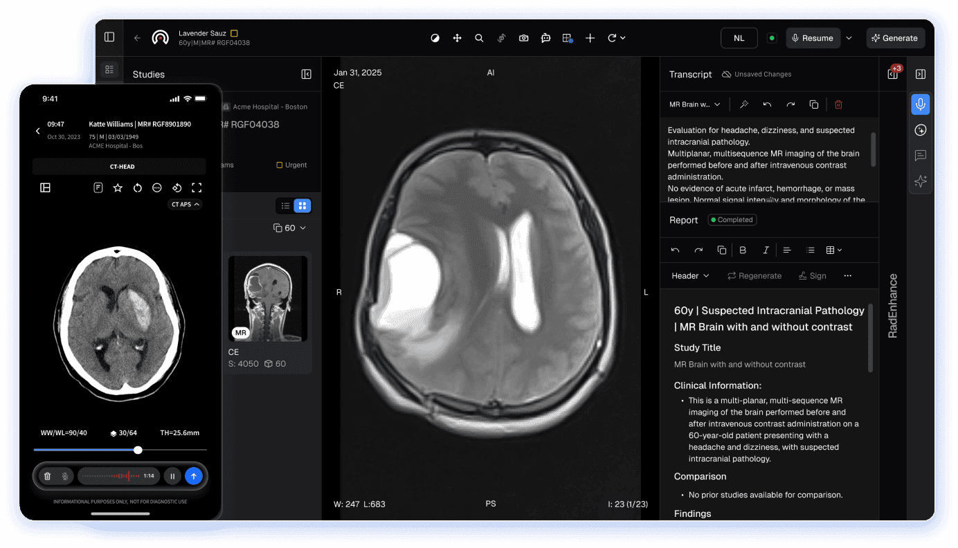 Yes. The platform includes web and mobile interfaces with a sleek, intuitive design, allowing radiologists to review images, generate reports, and collaborate securely from any device.